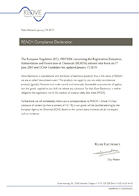 Klove Electronics is manufacturer and distributor of electronic products, thus, in the sense of REACH, we are so called “downstream-users”. The products we supply to you are solely non-chemical products (goods). Moreover and under normal and reasonably foreseeable circumstances of application, the goods supplied to you shall not release any substance. For that, Klove Electronics is neither obliged to the registration nor to the creation of material safety data sheet (MSDS).